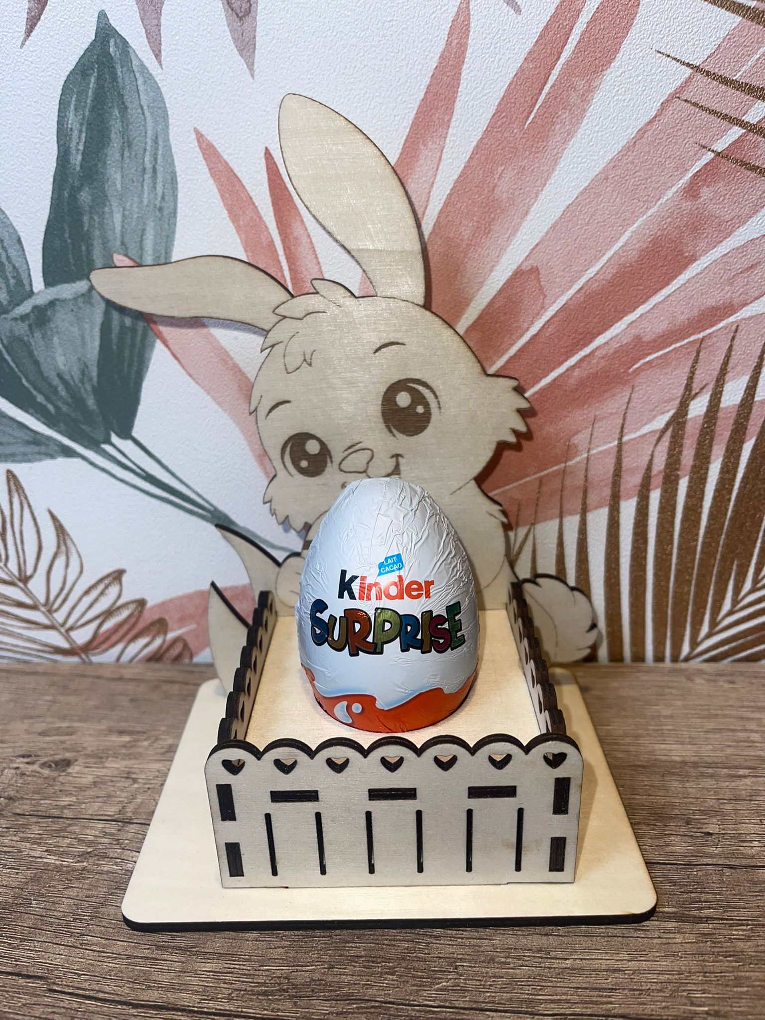 Ce charmant support en bois naturel en forme de lapin apporte une touche de magie à vos célébrations de Pâques. Parfait pour présenter un œuf Kinder Surprise ou tout autre petit œuf en chocolat, il transforme un simple cadeau en un moment mémorable.